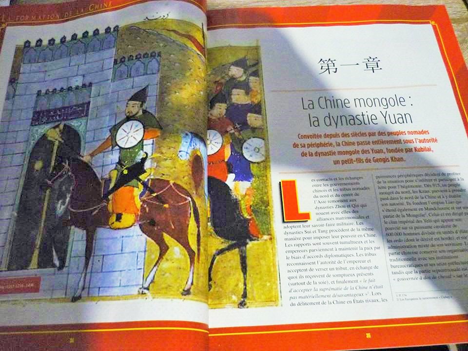 La Chine mongole de la dynastie Yuan (1279-1368) : En 1234 c'est au tour de la dynastie Jin d'être balayé par des mongols unifiés par Temujin, qui prendra le nom de Gengis qui signifie « puissant » et sera par la suite proclamé « Tchingis » (Gengis) Khan qui signifie « souverain universel ». Il dispose d'une armée compris entre 100 000 et 200 000 cavaliers. A sa mort il léguera à son 3e fils, Ogodaï, son empire qui deviendra la dynastie des Yuan (1279-1368) et dont la capitale sera Hebei (Pékin). Kubilai règne sur un empire multi-ethnique et multi-confessionnel (confucianisme, taoïsme, bouddhisme, lamaïsme, tibétain, islam et même le christianisme nestorien). Mais le fossé culturel entre les mongoles et les chinois est béant et peu de chinois acceptent de se soumettre à la dynastie Mongole. De plus, les mongoles sont de très bons guerriers mais ils sont pour la grande majorité illettrés. Ils sont donc contraints de faire appel à d'autres communautés pour faire fonctionner l'État comme les Ouïghours, les Jürchens sinisés, les arabes et quelques européens comme Marco-Polo. Mais très vite se généralise dans l'empire la corruption. Le gouvernement de Kubulaï est autoritaire car sa position est fragile et contestée, mais elle ne s'accompagne pas de persécution religieuses ou intellectuelles. L'empereur tente de faire coexister pacifiquement les communautés en laissant les chinois soumis à leurs lois générales et uniformes et pour les mongoles des des lois coutumières et tribales. Les mongoles gardent leur caractère belliqueux et lancent des guerres maritimes contre les Japon (1274), le Vietnam et Taïwan (1281) et Java (1292) qui s'avère désastreuses. Toutefois les Yuan relance l'activité économique des routes de la soie et cette dynastie connaît également un essor culturel mais qui reste presque inaperçu dans les campagnes dont la mission est de produire des céréales nécessaires à l'approvisionnement des villes et des garnisons. Mais très vite les tensions montent entre les chinois et le pouvoir mongol. Les paysans chinois se font confisquer leur terre et en 1351 des calamités naturelles provoque la famine. Les paysans rejoignent des sociétés religieuses comme le Lotus Blanc et des Jacqueries se forment créant ainsi la rébellion des Turbans rouges. Ce qui provoquera la chute de la dynastie des Yuan en 1368 et la proclamation de la dynastie Ming par Zhu Yuanzhang.