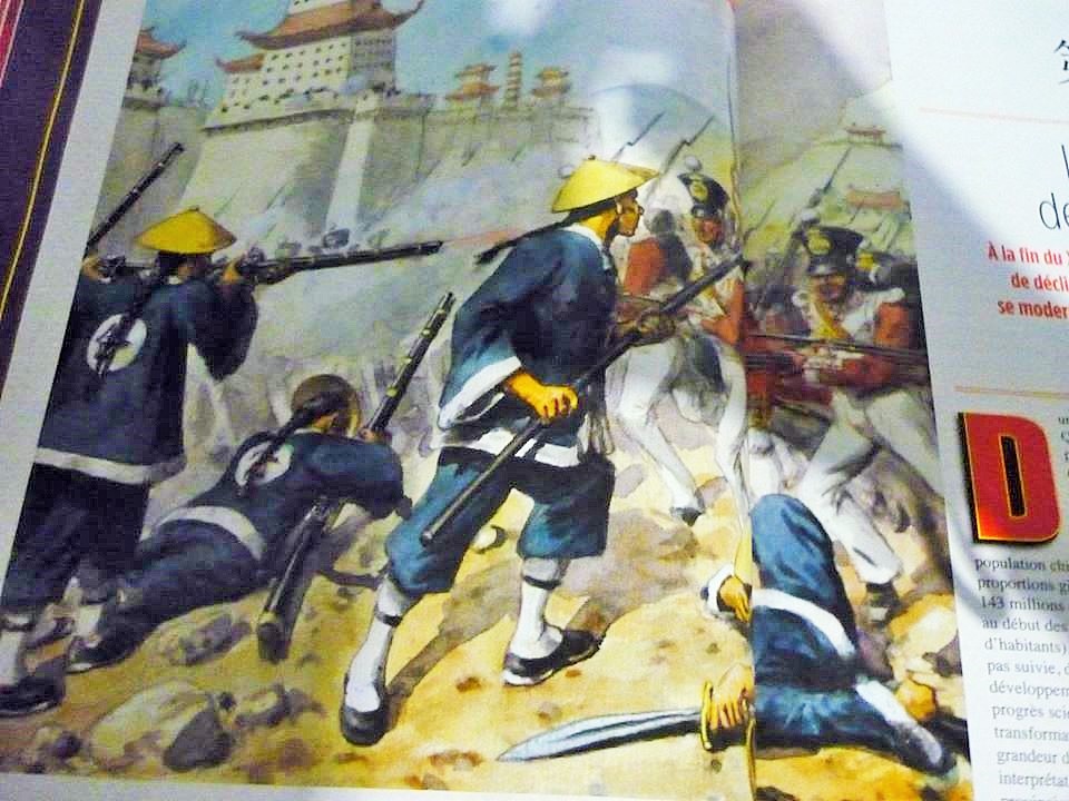 Le lent déclin de l'empire Qing et son achèvement par « l'ère des traités » : Ce déclin est marqué en partie par la corruption qui y règne au sein de la fonction publique, qui sclérose l'économie. Certains hauts fonctionnaires comme Heshen, un des ministres favoris de l'empereur Qianlong, qui se constitue qui équivaudrait aujourd'hui à 1 milliard d'euros. Cela provoque une succession de jacquerie fomenté par de sociétés secrètes et des sectes religieuses, dont parmi elle, le Lotus Blanc qui était déjà présent sous la dynastie Yuan. Cette secte du Lotus Blanc prospère dans les régions montagneuses du Hubei, du Sichuan et du Shaanxi. La révolte commence en 1789 par des agressions contre les collecteurs d'impôts. En 1804 la secte du Lotus Blanc sera vaincue par Jiaqing, le successeur de Qianlong, qui mettra en place des généraux plus compétents qui parviendront à vaincre les Lotus Blanc. Cependant, en 1813 de nouveaux soulèvements sanglants sont orchestrés par la secte des Huit trigrammes. Ils seront également anéantis mais les pertes humaines seront très lourdes puisqu'elles provoqueront la mort de 70 000 personnes. Entre 1826 et 1835 des troupes de musulmans chinois islamisés sèmeront le chaos dans le Turkestan. La situation dans les campagnes devient aussi dramatique, car elles sont touchées par des inondations et des famines de 1846 à 1848. Comme si tout cela ne suffisait pas, de 1839 à 1842, puis de 1856 à 1860 se déroulent les deux guerres de l'Opium. La première guerre fut menée par l'Angleterre après que la Chine ait décidé de refuser d'importer de l'Opium venu d'Inde car cette drogue avait des effets qui rendaient ses consommateurs euphoriques, hypnotiques et somnolents provoquant des ravages parmi la population. Une autre raison fut aussi que ce commerce de l'Opium provoquait de véritable fuite de capitaux vers l'étranger. En 1839, l'empereur Daouguang décide de stopper les importations de l'Opium et décide même d'encercler les établissements commerciaux de Guangzhou, qui a a cette époque la seule ville ouverte au commerce étranger. La réponse des Britanniques ne se fait pas attendre, l'Angleterre déclenche la 1ère guerre de l'Opium. Le 29 août 1842 le gouvernement est contraint de signer le traité de Nankin qui les contraint à la perte de territoire comme Hong Kong, à des dommages de guerre, ainsi qu'à l'ouverture forcé de 5 nouveaux ports pour le commerce étranger : Canton, Xiamen, Fuzhou, Amoi et Shanghai. Mais les États-Unis et la France considèrent que la Chine ne s'ouvre pas encore assez au commerce extérieur et une flotte franco-britannique bombarde la ville de Guangzhou en 1857, contraignant l'empereur Xianfeng à signer un nouveau traité en Tietsin en 1858, ce qui accorde de nouveaux ports aux étrangers. Pourtant, une nouvelle guerre éclate en mai 1868, après que furent assassinés des missionnaires occidentaux qui se sont accompagnés de tirs à canon sur des unités franco-britanniques. Cette guerre ne s'achève pas la prise de Pékin dans la nuit du 24 au 25 octobre qui soumet le gouvernement chinois à de fortes indemnités de guerre, doit accorder des droits civils aux chrétiens, et doit ouvrir tout le territoire aux missionnaires...